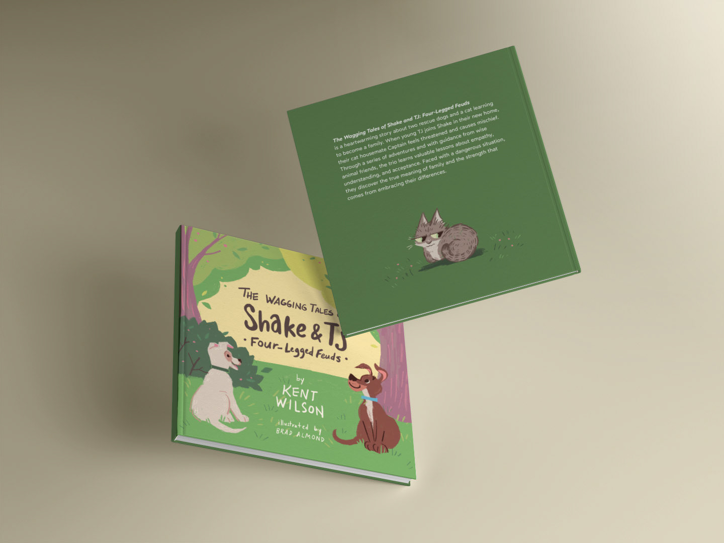 I was commissioned to design characters and illustrate for a passion project by Kent Wilson, who had this crazy idea to write a story about his family’s pets. The Wagging Tales of Shake & TJ is a collection of stories about friendship and found family. The characters each have a real-life counterpart, so Kent sent me photos of each animal to reference for the character designs.
